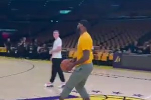 羁绊来了!老詹赛前身穿77号短袖乱秀超远三分