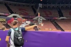 逆天球感😱东契奇此前从观众席扔进超远三分!队友看傻认输了