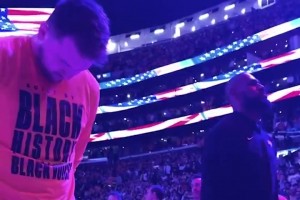 东契奇和詹姆斯赛前一起唱国歌,老詹全程各种乱动,东子一直低着头