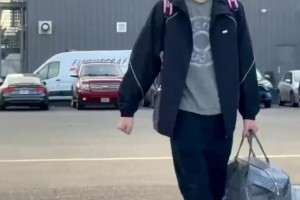 完美融入~开拓者飞往客场,杨瀚森背小粉书包与工作人员打招呼~
