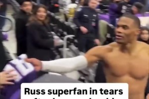 暖心一幕!威少脱下球衣赠送铁杆粉丝,球迷落泪:这是第10件了