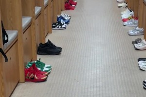 中国男篮更衣室,所有鞋服摆放整齐统一!