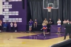 名场面:啦啦队在场边观看,詹姆斯热身时连续冲刺全场上篮!