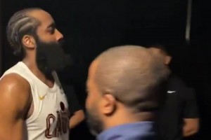 心情不错!哈登赛后走回球员通道,路上还和好友开了个玩笑~