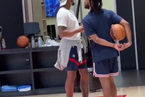 受伤的比尔现在已不用拐杖 在训练后与加兰+邓恩交谈