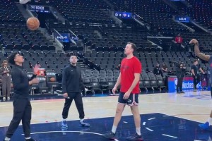 备战尼克斯!小卡赛前投篮热身,神准中投9投8中!