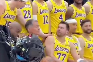没想到都报销了😭此前湖人大合照,东契奇里夫斯哥俩打打闹闹