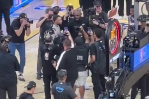 ❤️库里赛后与詹姆斯、布朗尼、雷迪克拥抱互动~