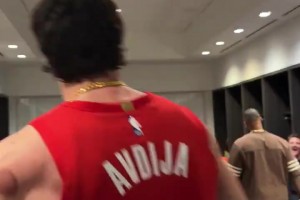 阿夫迪亚拿到了晋级季后赛的项链!更衣室庆祝胜利