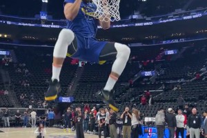 金州拉文上线~库里赛前秀自抛自扣!双臂“霸气”挂筐😂