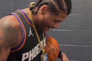 赛后杰伦·格林戴上本场关键球员手机项链,狄龙&布克激情庆祝!