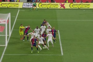 奥尔莫主罚角球击中立柱!后点库巴西对抗中倒地没能补射!