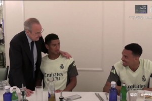 合理!贝林厄姆向弗洛伦蒂诺介绍新签下的球员阿诺德😂