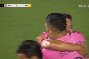 阿尔巴传中造点苏亚雷斯主罚破门,看台上的梅西咧嘴笑了出来😂