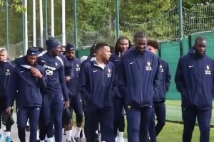 姆巴佩和登贝莱并肩而行,和一旁的小图拉姆有说有笑😉