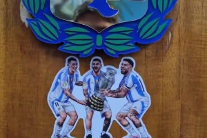 梅西在更衣室的储物柜上贴了一张他与迪马利亚、奥塔门迪的合照