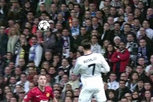 慢动作欣赏C罗面对曼联的这粒头球!膝盖和埃弗拉的头部一样高