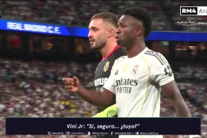 黄潜门将试图干扰维尼修斯,姆巴佩看到后一把推开他