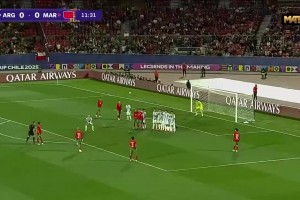 阿根廷门将出击放倒对手VAR判罚任意球!摩洛哥任意球直接破门!