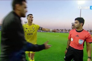 C罗点赞!半场结束不满判罚找到裁判争论