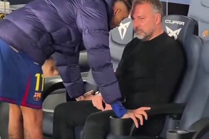 赢球也不高兴!弗里克赛后独坐替补席神情严肃,拉菲尼亚上前交流