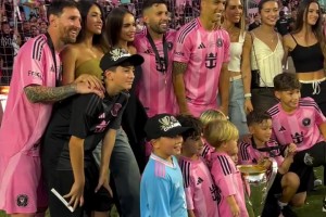 迈阿密国际夺冠!梅西、苏亚雷斯、阿尔巴、布斯克茨家庭合影❤️