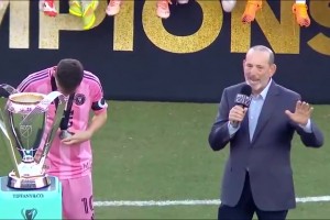 美职联主席颁奖致辞,一旁的梅西低头翻看总冠军奖牌🏅