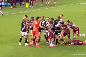 巴西杯赛场球员冲突混战一团!主裁判硬是一张牌也没有掏!