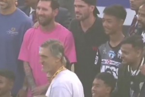 与梅西合影时,一名男子将孩子推到一边,但德保罗将他拉了回来