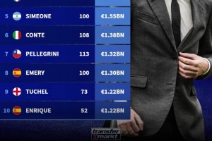 足坛主帅历史引援花费排行:瓜帅25.1亿领跑,穆帅19.9亿