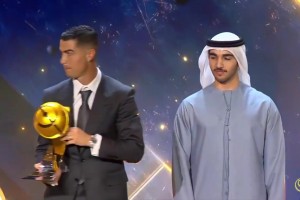 连续三年获奖!C罗现场领取2025环足奖年度最佳中东球员奖杯