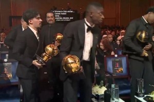 亚马尔太多奖杯了,以至于不知道该把哪个奖杯带上台😂