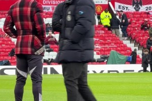 曼市德比前瓜迪奥拉和纳尼在场边交流,纳尼还穿着曼联的训练裤~