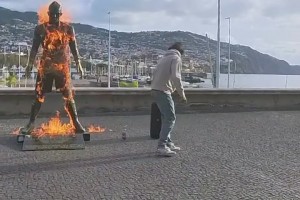 胆子这么大!男子放火烧马德拉岛上的C罗雕像