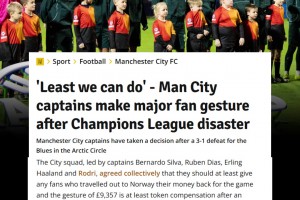 RNM退钱!曼城队长联合决定,报销球迷欧冠远征门票9357镑