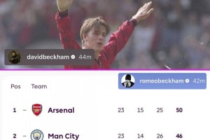 小贝向他阿森纳球迷儿子罗密欧喊话,后者回复了一张积分榜照片
