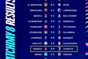 欧冠联赛阶段最后一轮18场比赛,摩纳哥vs尤文是唯一没进球的比赛