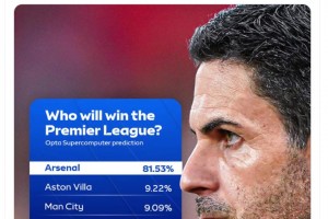 天空体育:Opta超级计算机预测阿森纳81.53%概率夺冠