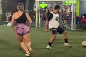 踢球碰到这样的猛女,你防得住吗?😂