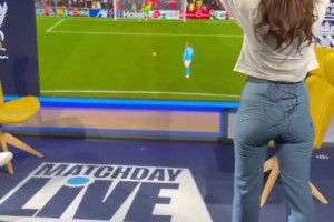 紧张!英国美女模特兼曼城电台主持娜塔莉看哈兰德点球