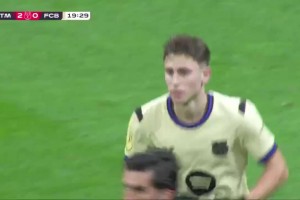 巴萨右路角球造险!费尔明禁区转身抽射击中横梁!