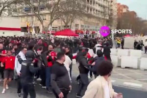 乱成一片❗️本菲卡球迷与马德里警方在伯纳乌附近发生冲突