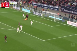 沙明摆脱防守杀入禁区,小角度打门完成双响!