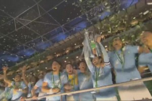 蓝月捧杯时刻!曼城领取冠军奖牌,B席高举奖杯全队庆祝!