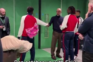聊啥呢?瓜迪奥拉与萨卡、埃泽和加布里埃尔交谈