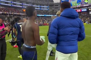 你俩一个季节吗?姆巴佩和维尼修斯闲聊时一个穿羽绒服一个光膀子