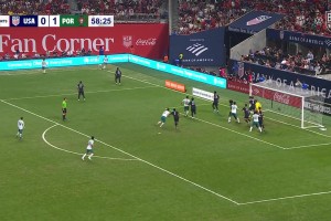 B费拿球到禁区右路后脚跟回做,特林康停球后推射破门!