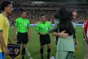 巴西女足传奇玛塔负责抛硬币开球,和莫德里奇、马基友好拥抱