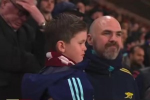 在阿森纳爆冷被南安普顿淘汰出局后,小枪迷在爸爸怀里哭了