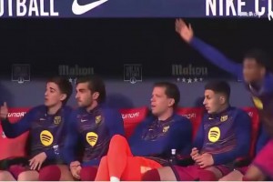 看乐了🤣当冈萨雷斯试图用手接球时,巴萨替补席的反应